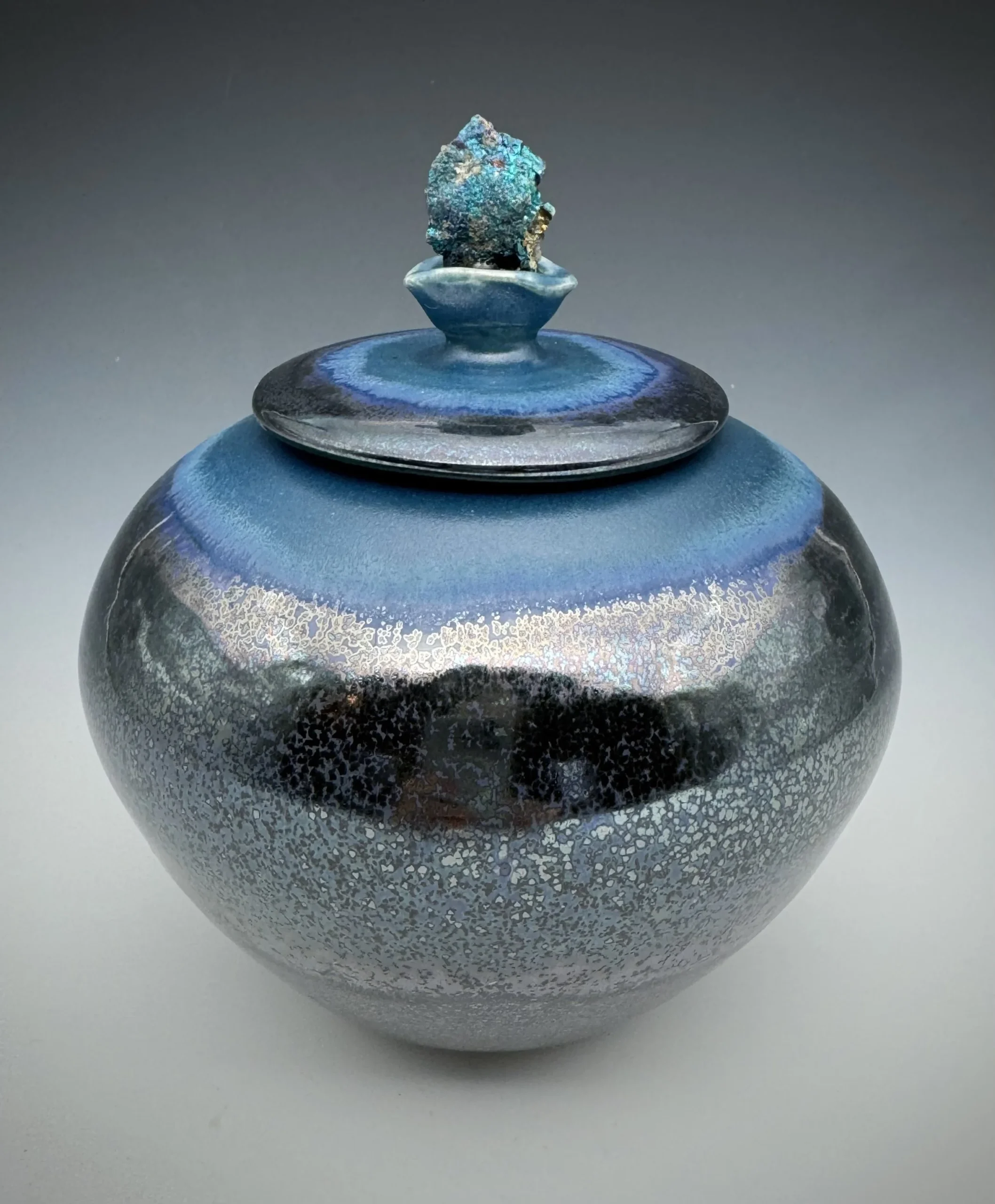 The lid sits flush and secure, echoing the curve of the vessel while adding a refined sense of closure. At its crown, a peacock ore gemstone serves as the handle, offering a striking organic contrast. The gem’s natural metallic blues, greens, and hints of gold complement the glaze beautifully while adding a raw, elemental presence. Each facet reflects light differently, making the urn feel alive and ever changing.