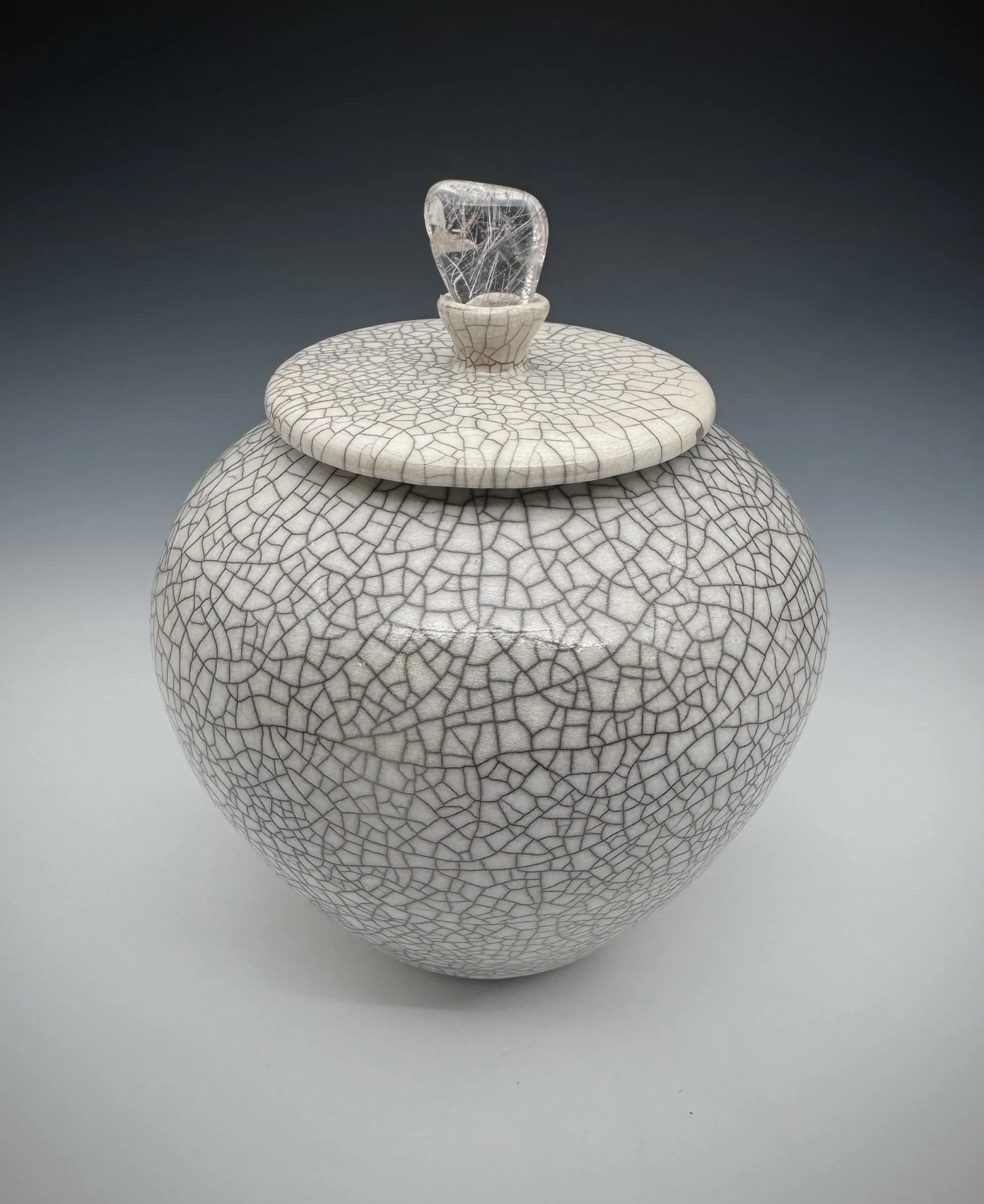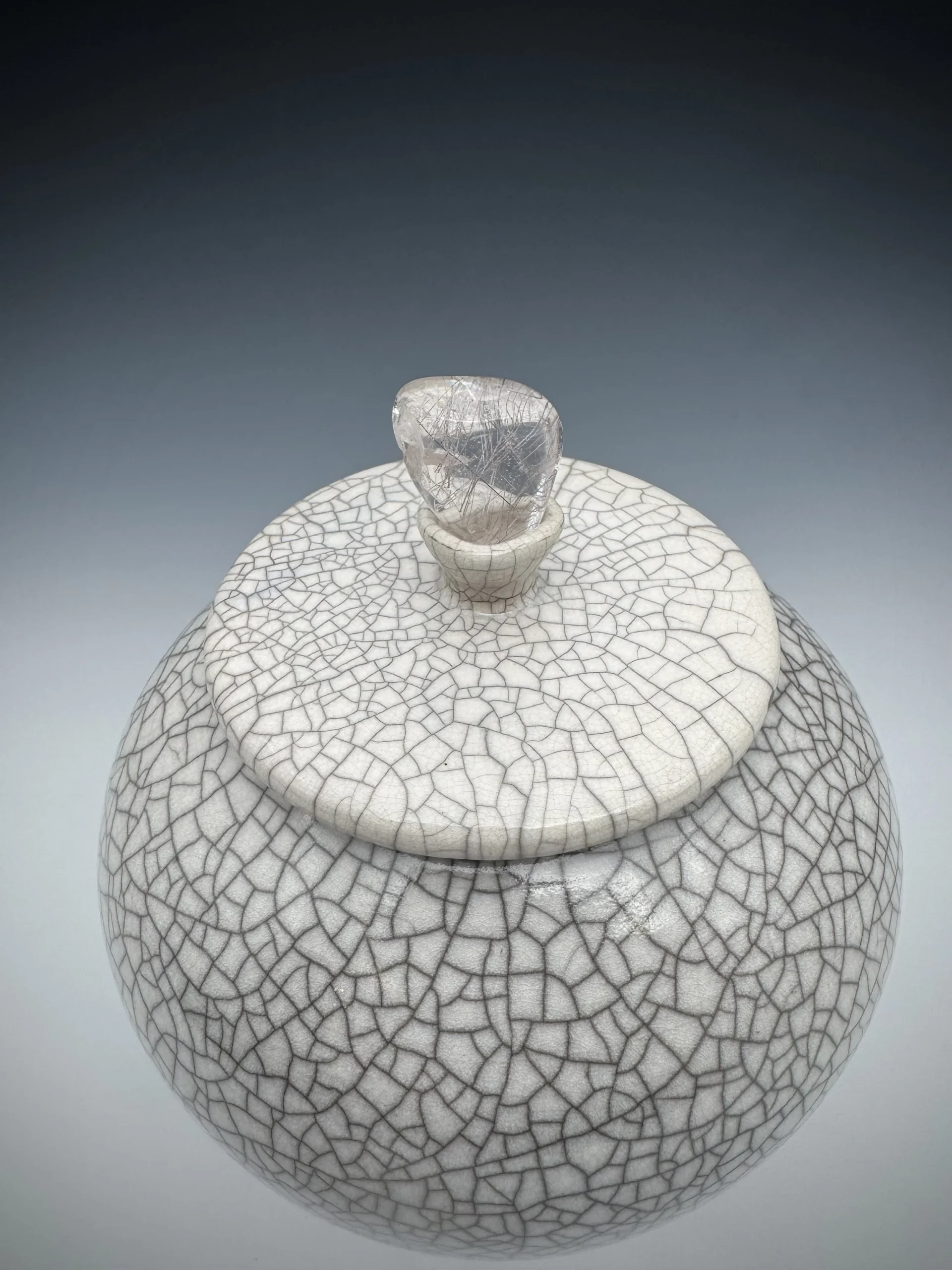 The lid rests atop the form, echoing the curve of the body and reinforcing a sense of wholeness. At its center sits a clear rutilated quartz handle, polished smooth and gently rounded. Fine needle-like inclusions are suspended within the crystal, catching light and offering a quiet contrast to the porcelain surface below. The stone feels both delicate and grounding, adding an organic focal point without overpowering the form.