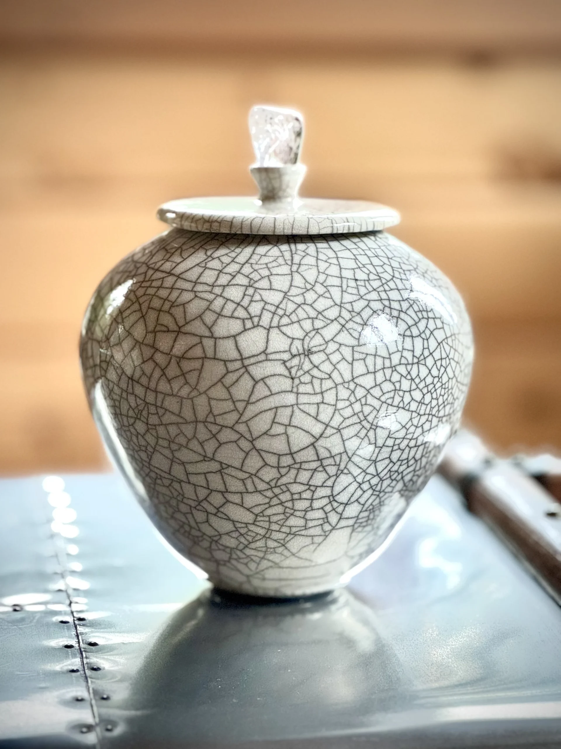 The gloss glaze reveals an intricate crackle pattern that spans the entire surface, resembling fine networks of lines formed naturally during the firing process. It varies in density and direction, giving the urn a sense of movement and depth while maintaining an overall softness. The color remains restrained and luminous, with warm ivory tones and gentle gray shadows settling into the crackle, emphasizing the porcelain’s peacefully refined character.
