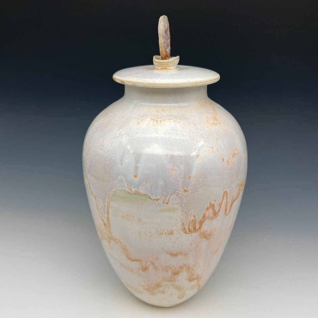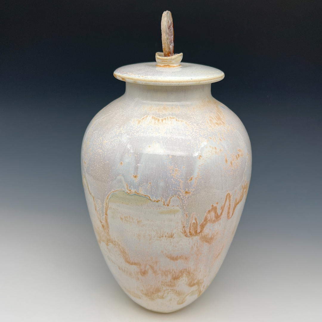 Soft as a morning sky and restless as moving water, this porcelain urn is a study in atmospheric beauty. Kathy Cady has thrown a form of graceful, classical proportion, its tall ovoid silhouette rising with unhurried elegance from a narrow foot to gently rounded shoulders, the kind of shape that has anchored ceramic tradition for centuries while feeling entirely present and alive.
