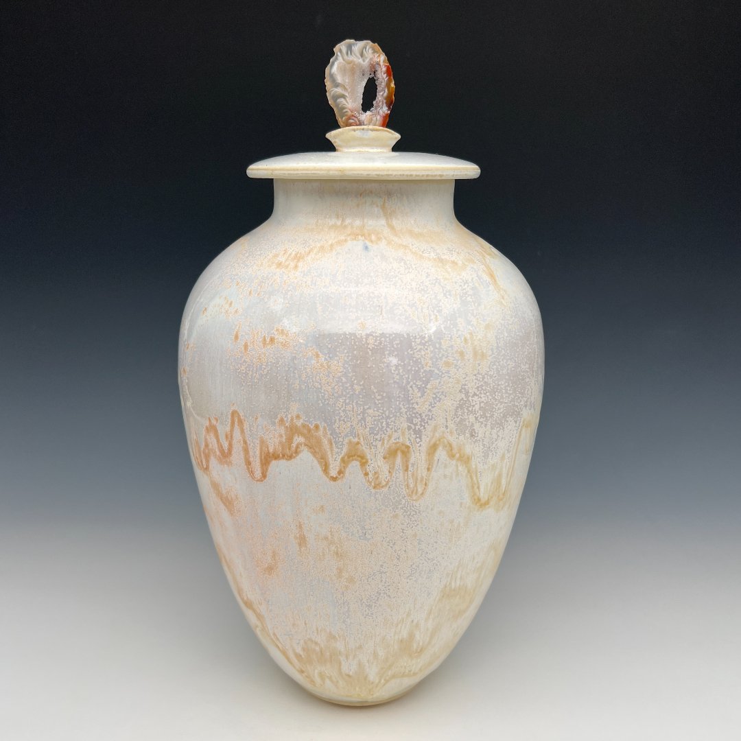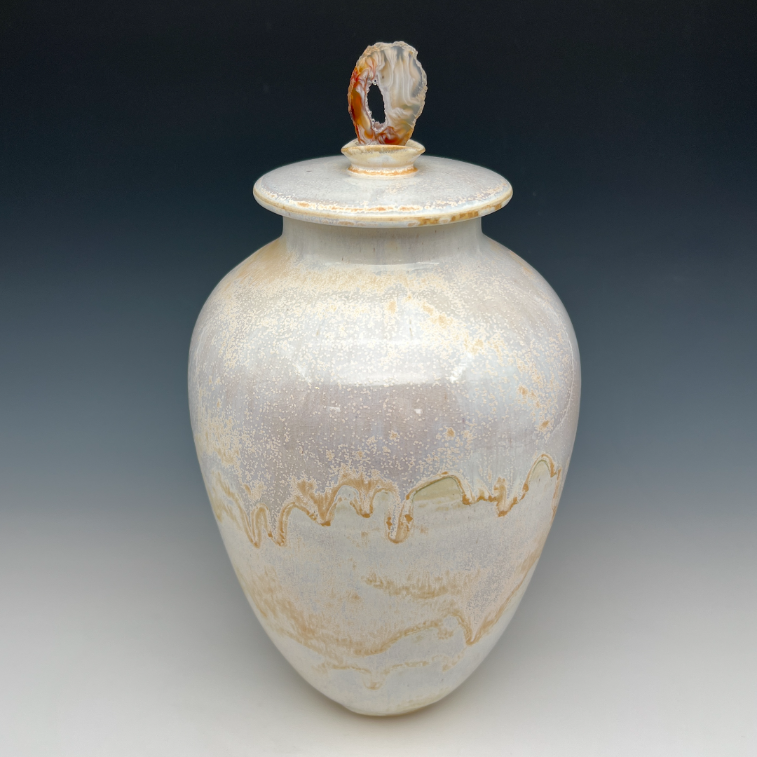 The flat disc lid continues the soft atmospheric palette, its rim edged in the same warm gold that echoes the body’s flowing mark. And above it all presides the urn’s most striking element: a polished agate slice, deep rust and cream at its carved edges, opening at its center to a hollow eye ringed with translucent banded layers. It is geological and gorgeous, a window into the earth itself.