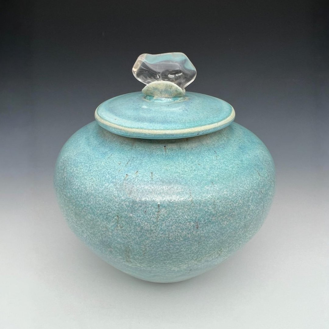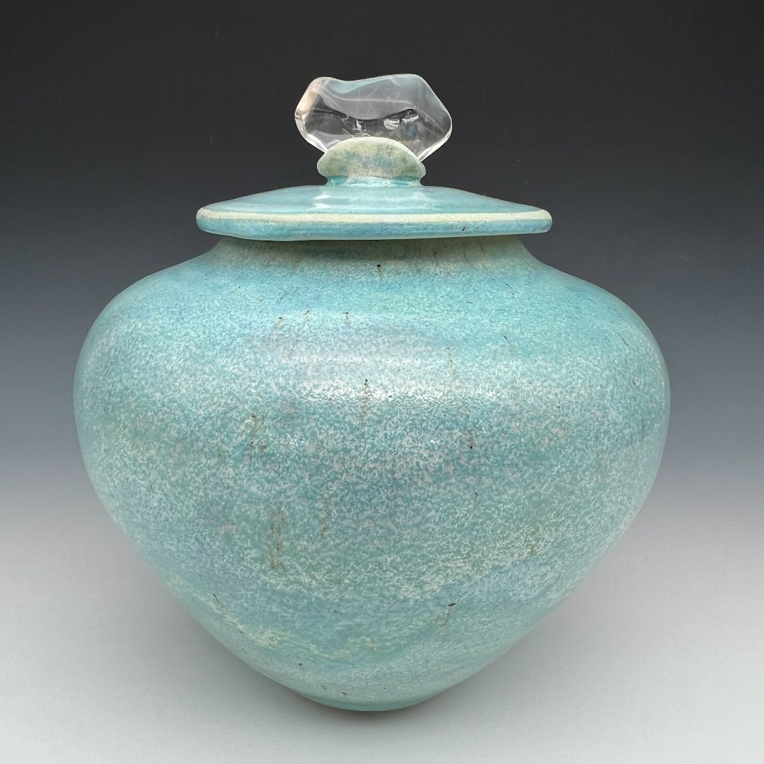 This urn holds the color of shallow tropical water over white sand, of Caribbean bays caught in afternoon light, of the particular luminous turquoise that exists at the exact meeting point of sky and sea. Kathy Cady has achieved something genuinely rare here: a soda-fired porcelain surface so alive with color and texture that the vessel seems to generate its own quiet radiance.