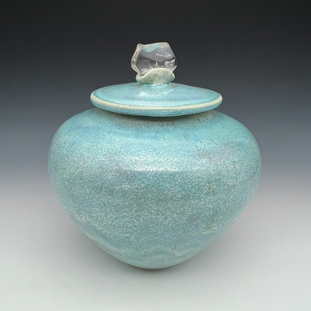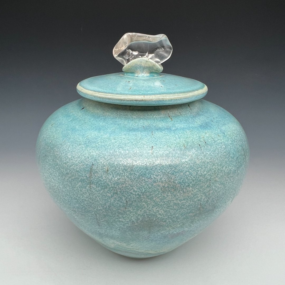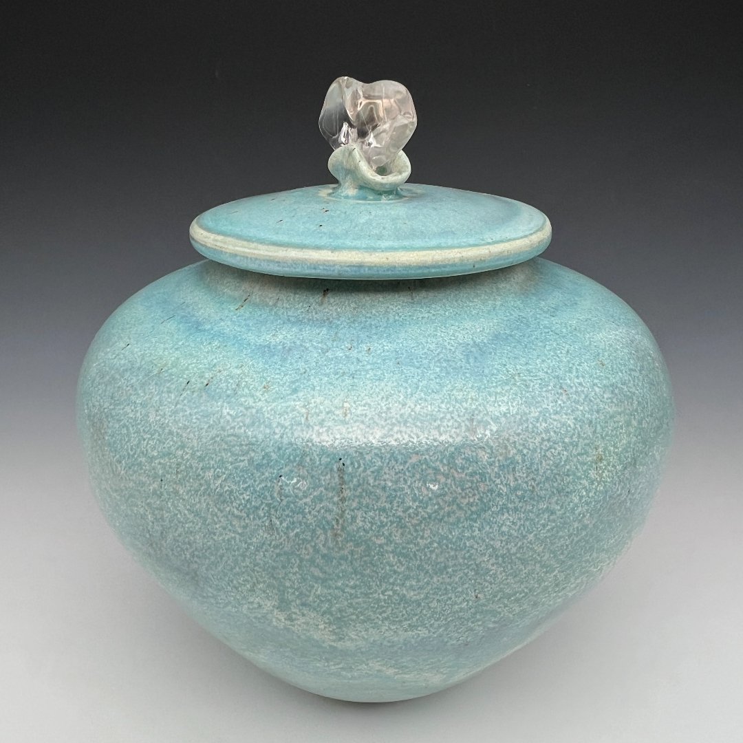 The form is Cady at her most resolved: a compact, wide-shouldered sphere that sits close and full, with a low center of gravity that communicates permanence and protection. The disc lid fits cleanly, its rim edged in a fine line of unglazed porcelain that glows cream white against the surrounding turquoise, a precise detail that elevates the whole. A polished clear quartz crystal rises from a small domed collar at the center of the lid, its faceted planes and interior clarity offering a crystalline counterpoint to the warm, organic texture of the fired clay beneath. Water and ice. Earth and sky.