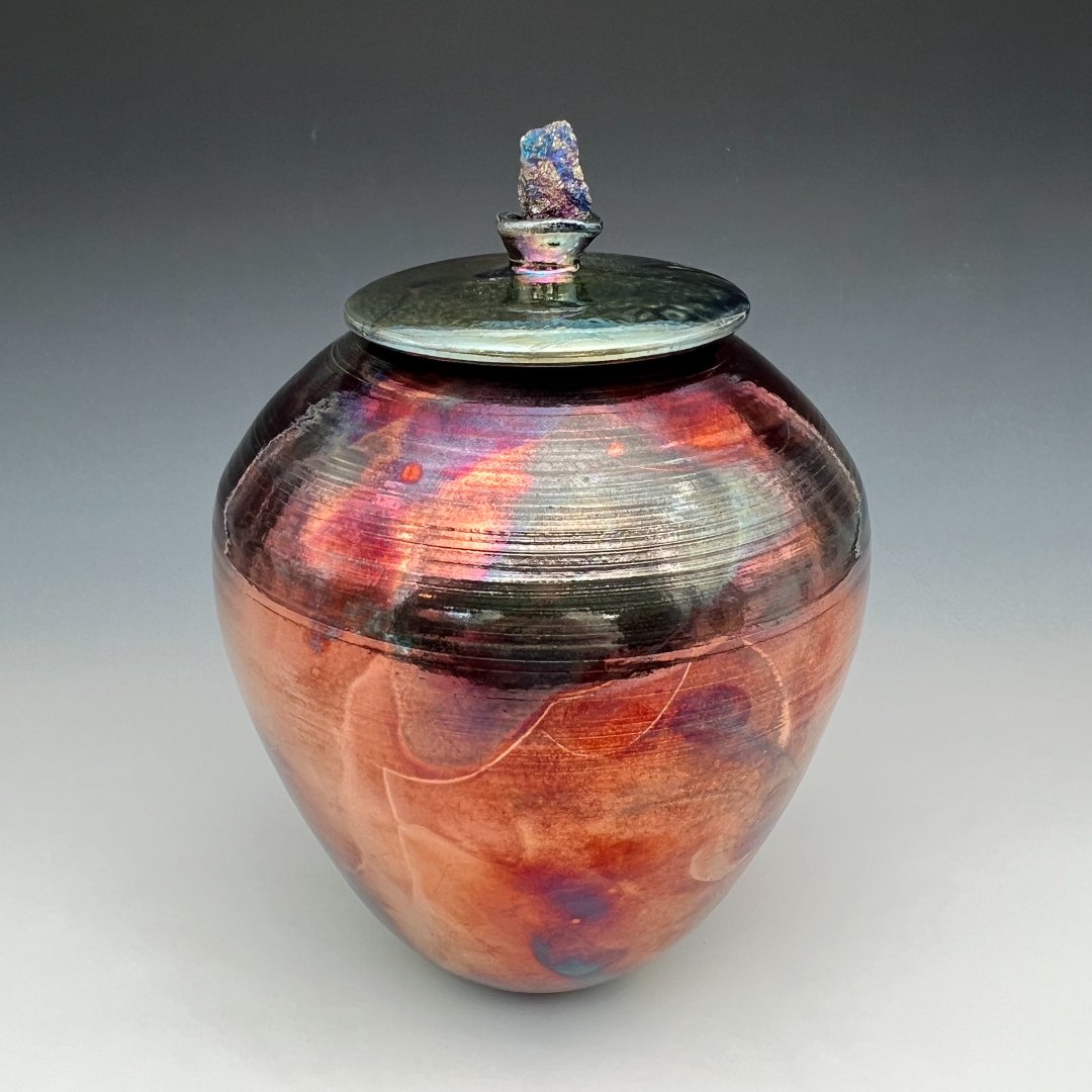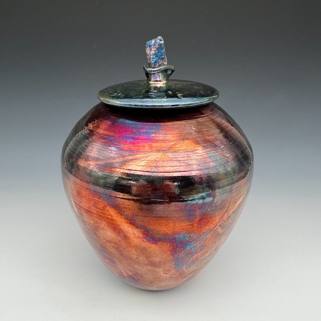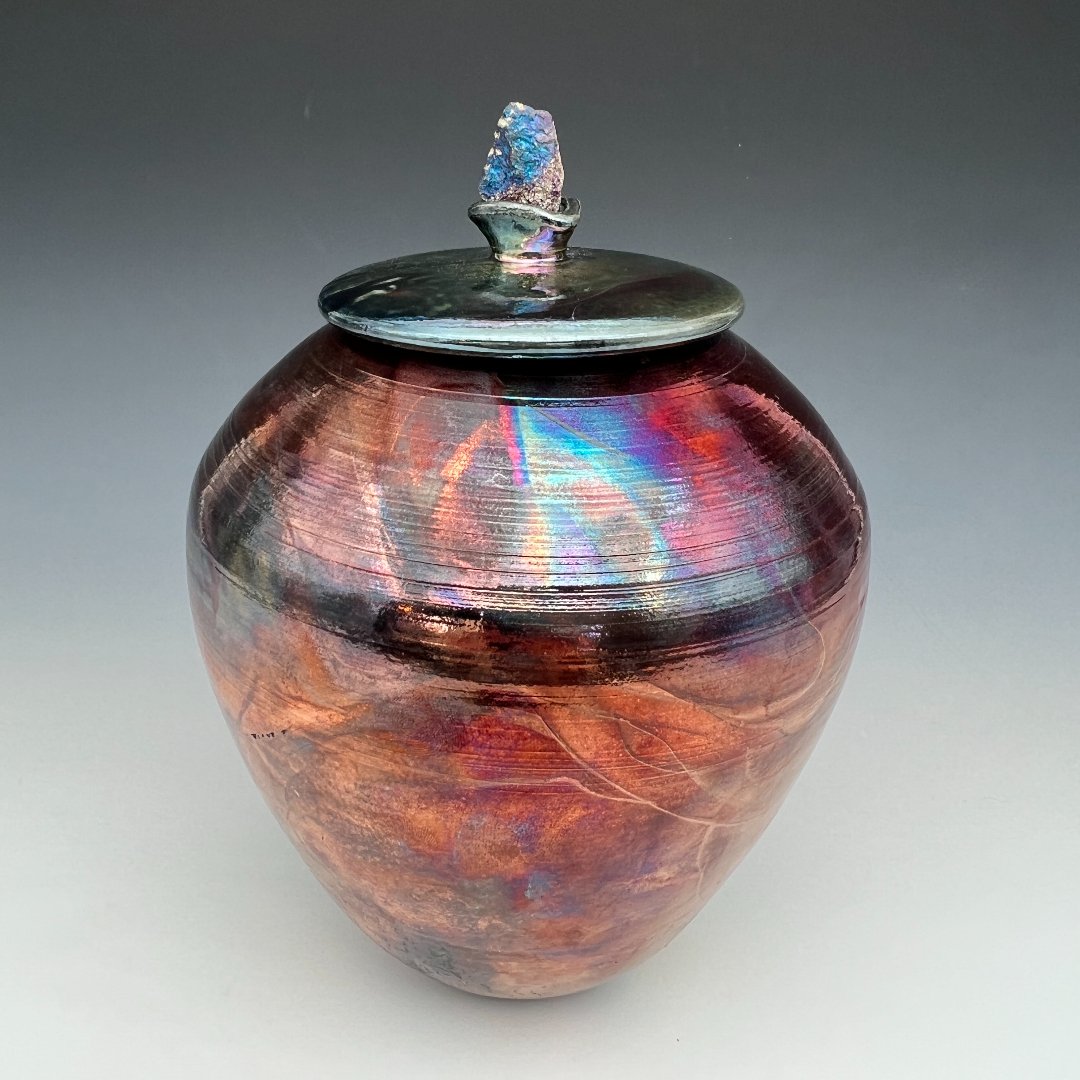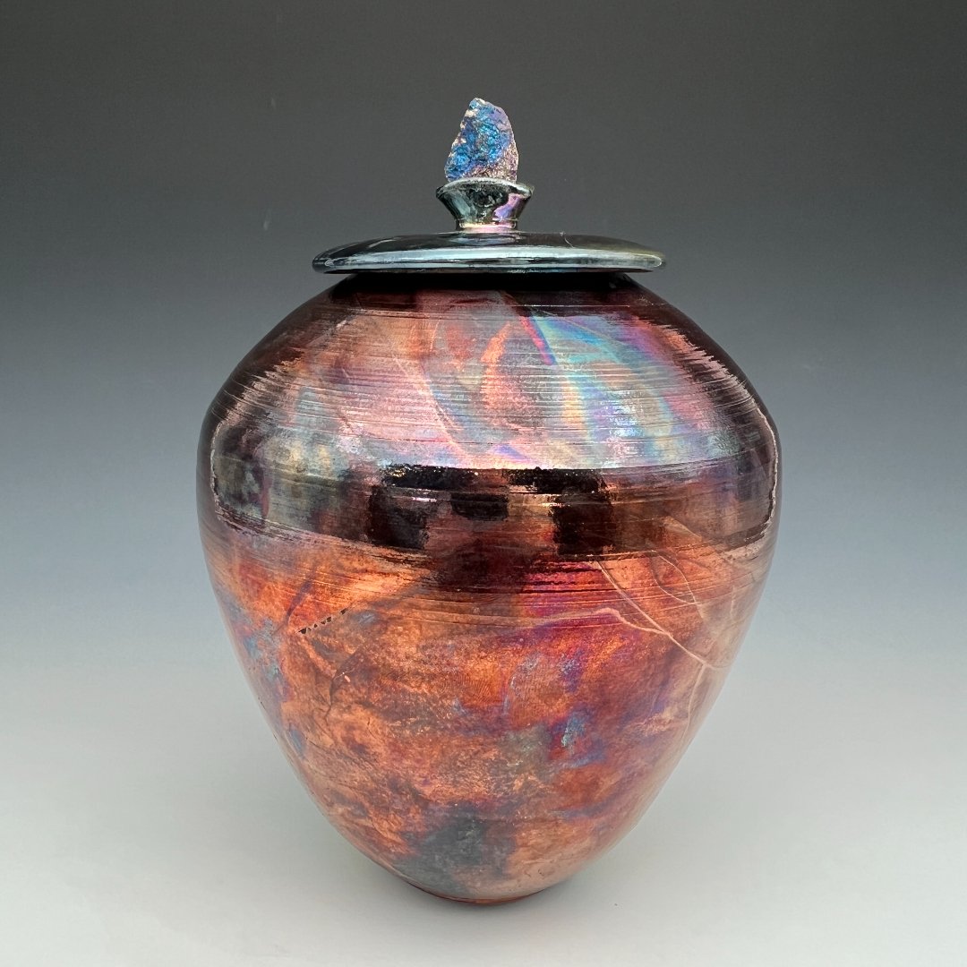 This urn does not simply reflect light. It transforms it. Raku-fired and post-firing reduction glazed, this wheel-thrown vessel by Kathy Cady achieves one of the most visually arresting surfaces in all of ceramic art: a fully iridescent metallic lustre that shifts and shimmers with every change of angle and illumination, cycling through deep burgundy and copper, then suddenly blazing with spectral flashes of electric blue, violet, and rainbow interference color, like oil on dark water or the inner surface of an abalone shell.