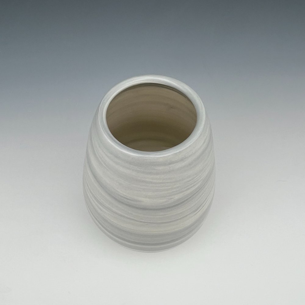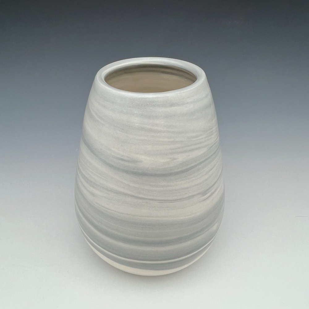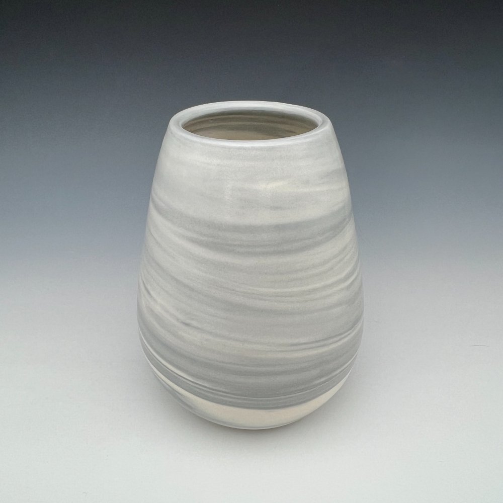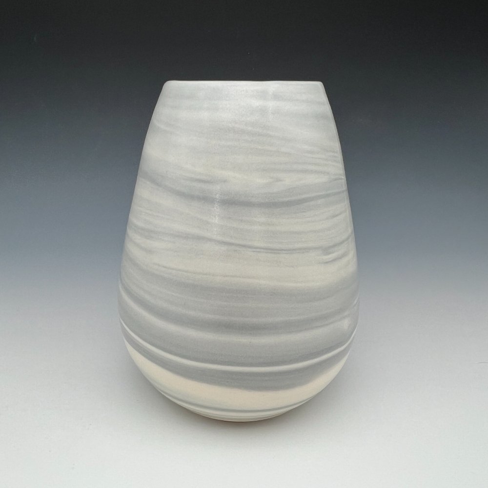 Soft as winter light on fresh snow, this agateware vase by Kathy Cady carries its color not on its surface but within the clay itself. Grey and white porcelain, wedged and thrown together, flow in gentle horizontal striations around a form that rises from a narrow unglazed foot to a wide, confident shoulder before tapering inward to a modest opening. The satin glaze unifies everything in a quiet, silky finish that rewards close looking.