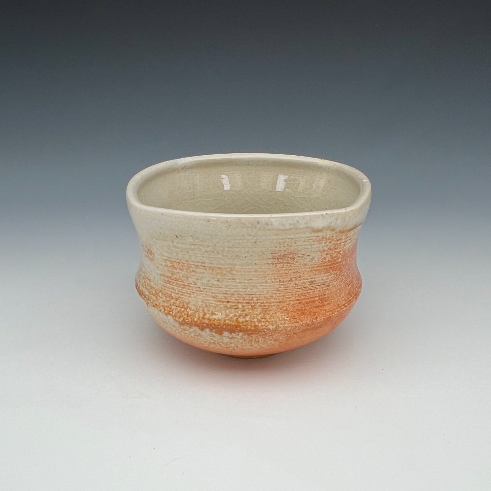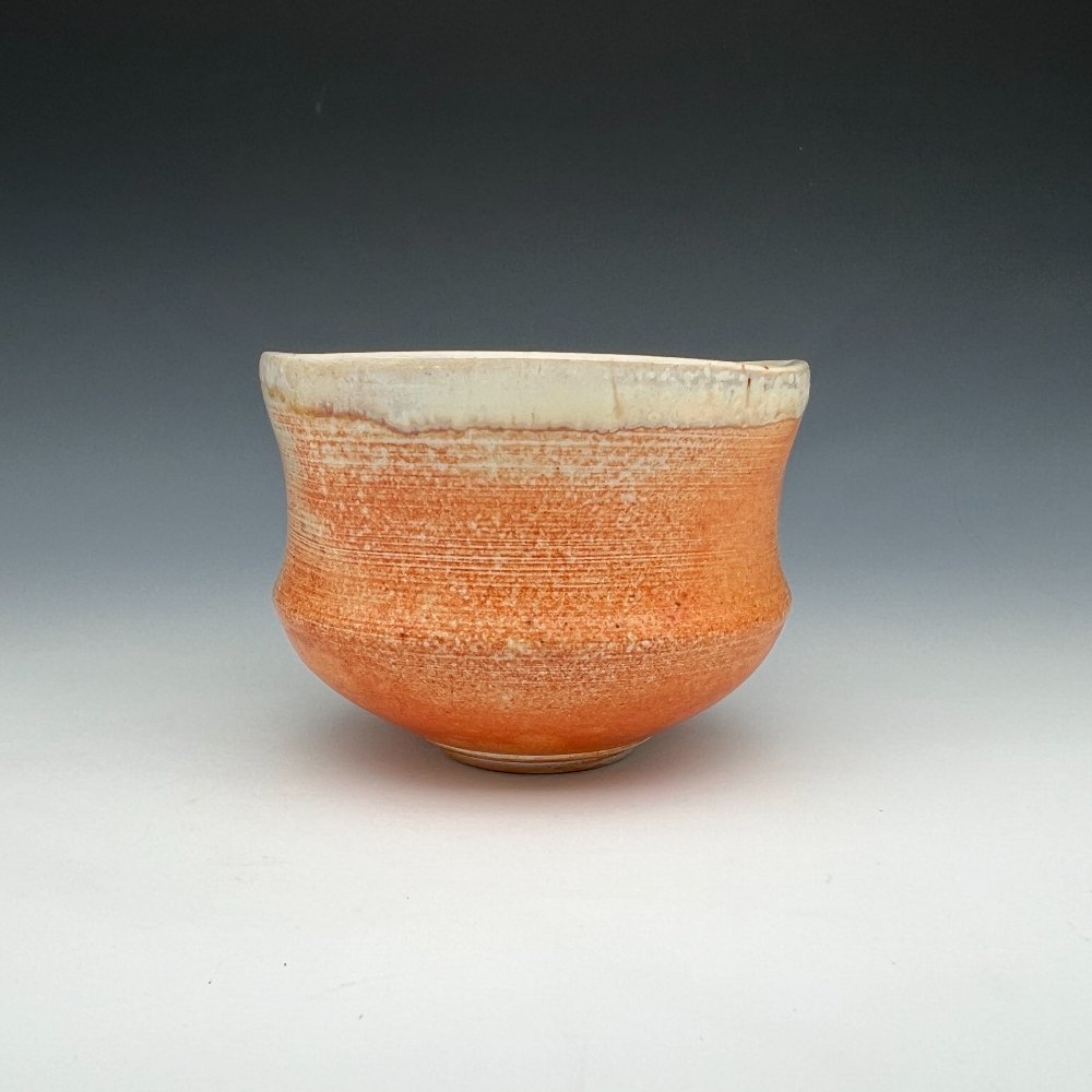 The exterior tells a story of fire and earth.  A creamy white soda glaze drapes over the upper exterior and rim like fresh snow settling on rough iron stone, the two surfaces meeting in an irregular, dripping boundary that is purely spontaneous.