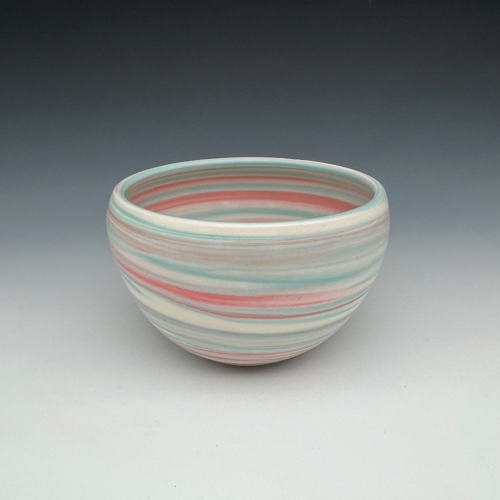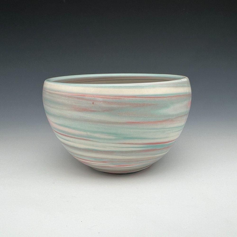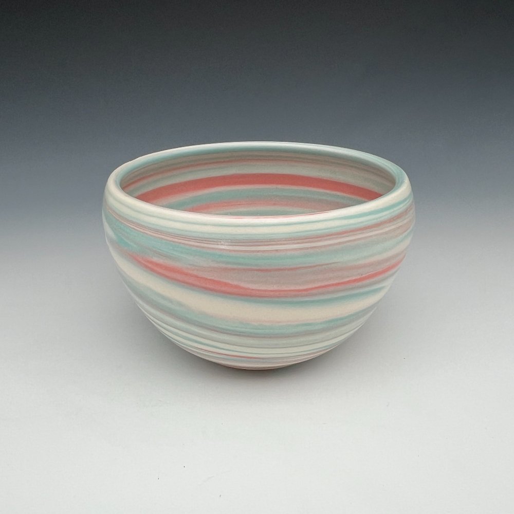 Larger and more openly proportioned, this agateware porcelain bowl by Kathy Cady carries the same joyful language of color-through-clay but speaks it with greater confidence and sweep. Coral pink and aqua mint flow through bright white in broad, generous bands that wrap the exterior in long horizontal ribbons, the colors distinct and clear against one another, unhurried in their passage around the form.