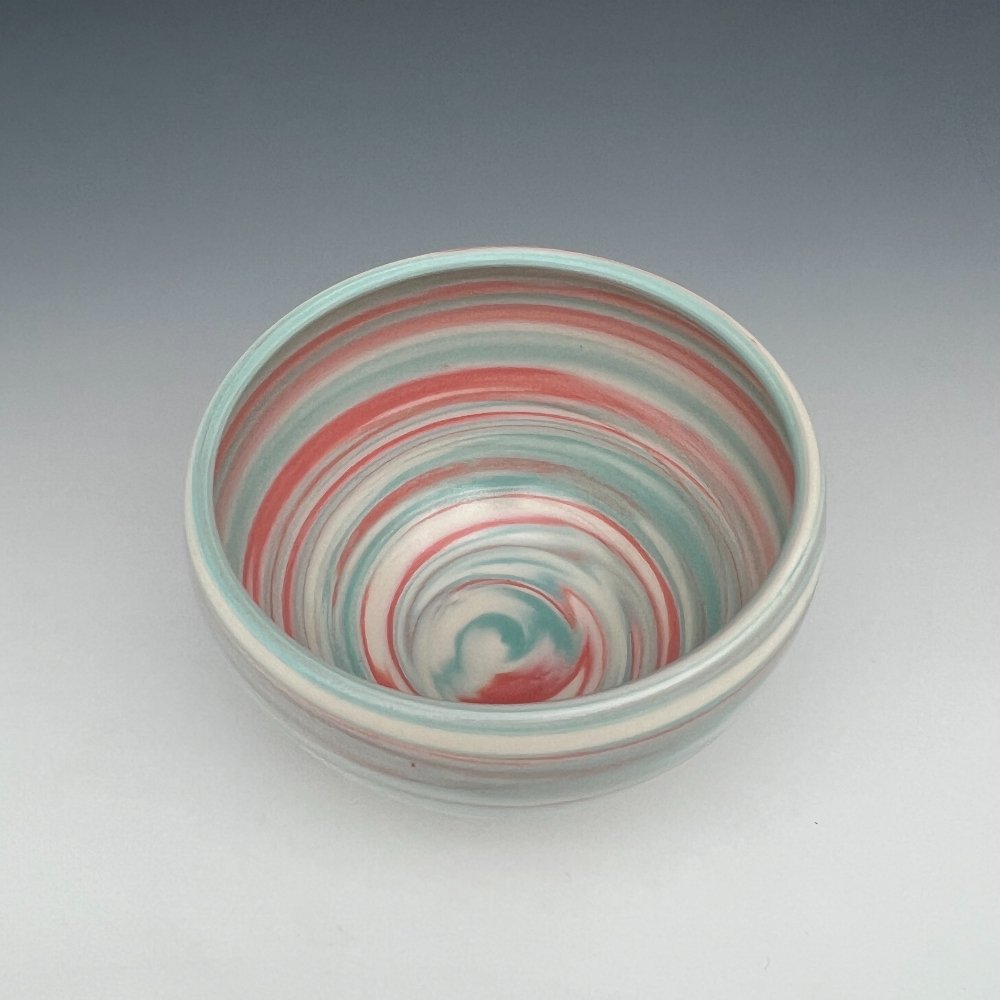 The interior reveals the technique at its most thrilling. Looking down into the bowl is like watching a whirlpool of color frozen mid-motion, the three porcelain clays spiraling inward from the wall to the center floor in a tight, luminous vortex that changes with every shift of light. These are not surface decorations. This color lives all the way through the clay body, an inseparable part of the material itself.